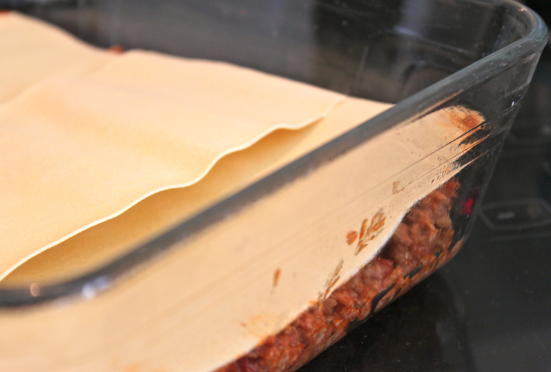 Je commence par étaler une première couche de sauce bolognaise (il ne faut pas qu’elle soit trop liquide, si c’est le cas repasser au feu vif la préparation jusqu’à évaporation). Ensuite j’ajoute les feuilles de lasagnes déshydratées, autant qu’il en faut pour recouvrir entièrement la couche inférieure.