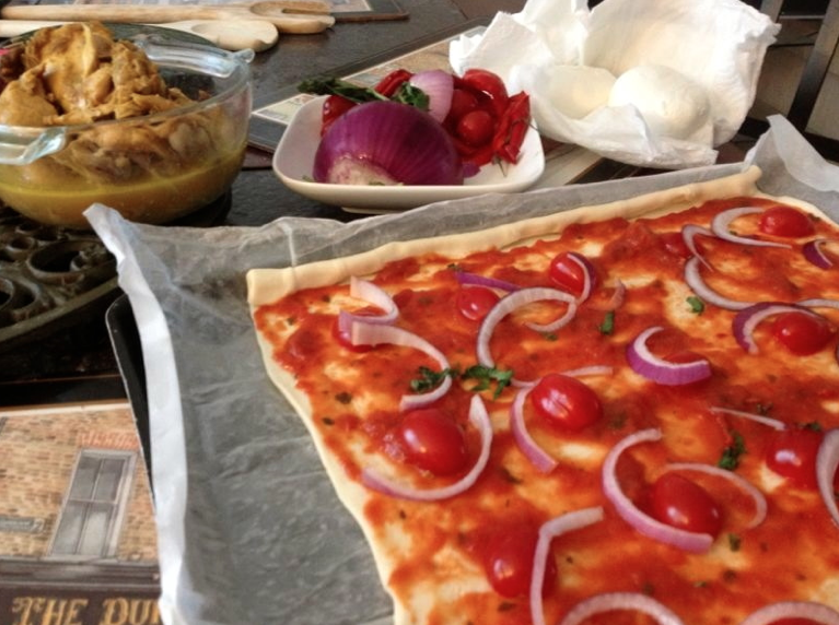 Etaler un peu de sauce arrabiata sur la pâte (pas trop ça sert à rien). Couper des tomates cerise en deux et les poser sur la pâte. Couper en lamelles le quart d’un oignon, les déposer sur la pâte. Parsemer d’un peu de basilic haché.