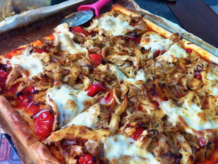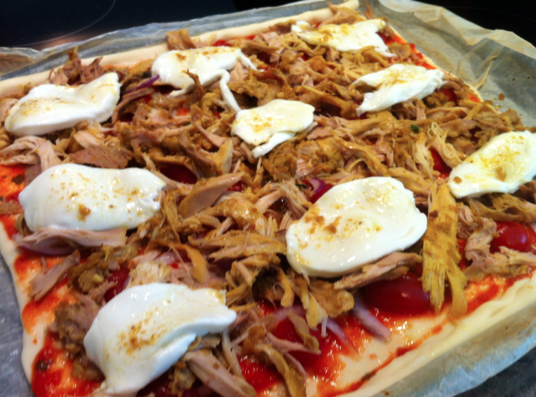 Effiler le poulet avec les doigts et déposer les morceaux sur la pizza. Couper la mozzarella en tranches, déposer.