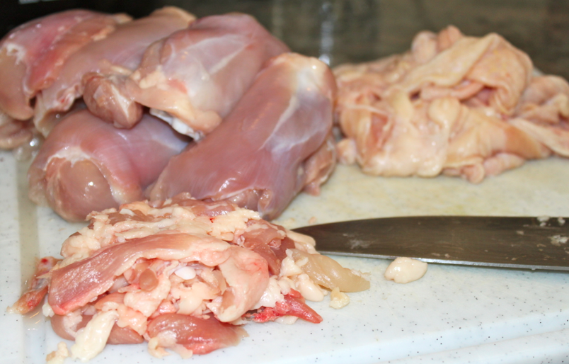 Enlever la peau et le gras du poulet. Jeter le gras et réservez la peau.