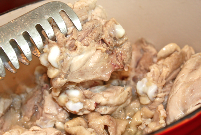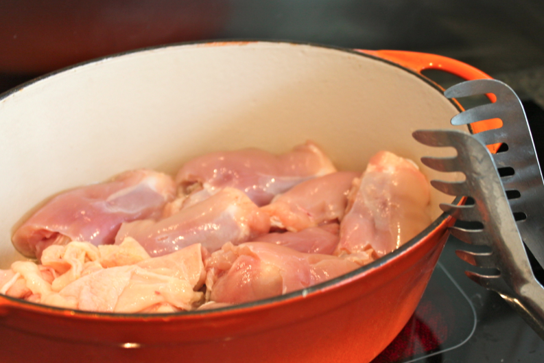 Faire revenir le poulet et la peau dans un tout petit peu d’huile à feu moyen à vif. La peau va rendre du gras donc vous n’êtes même pas obliger d’ajouter de l’huile. Comme récipient j’utilise une petite cocote en fonte mais on peut utiliser une cocote basique, ou une poêle si tenté qu’elle soit assez profonde.