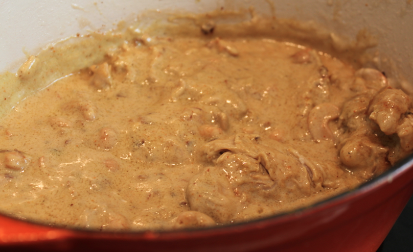 Une fois que l’oignon, l’ail et les échalotes ont bien dorés et sont devenus translucides retirer la peau de poulet (que vous pouvez maintenant jeter). Incorporer les noix de cajou et faire dorer pendant quelques minutes.