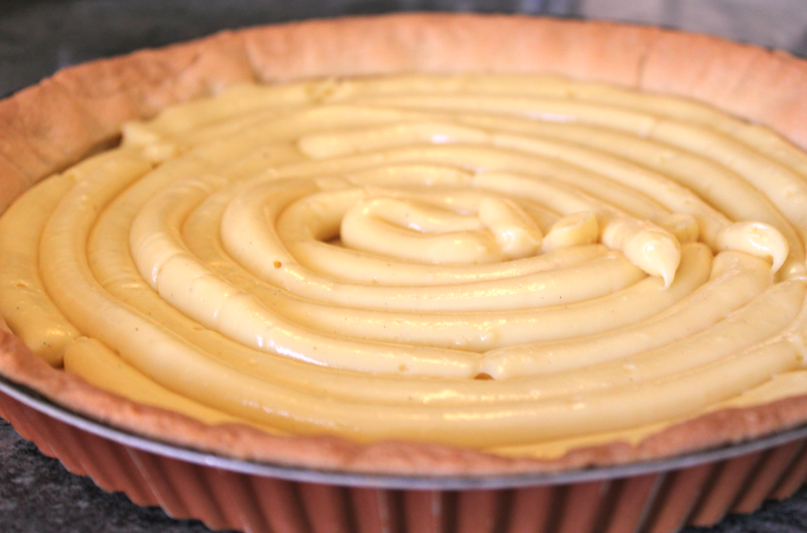 Lorsque la crème a refroidi l’étaler sur la pâte sucrée qui a eu le temps de refroidir aussi un peu. Pour une belle répartition de la crème j’utilise d’abord une poche douille et puis je lisse la crème.