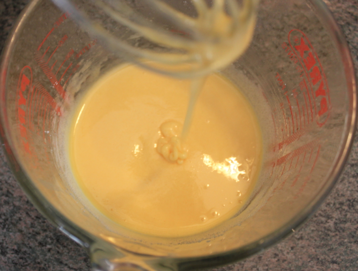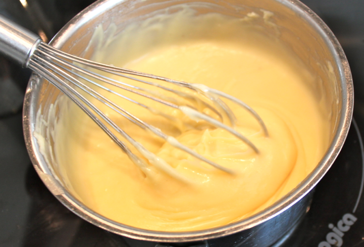 Fouetter sans interruption la préparation à feu moyen à vif. La préparation va vite épaissir et prendre une belle couleur jaune. Continuer à fouetter.