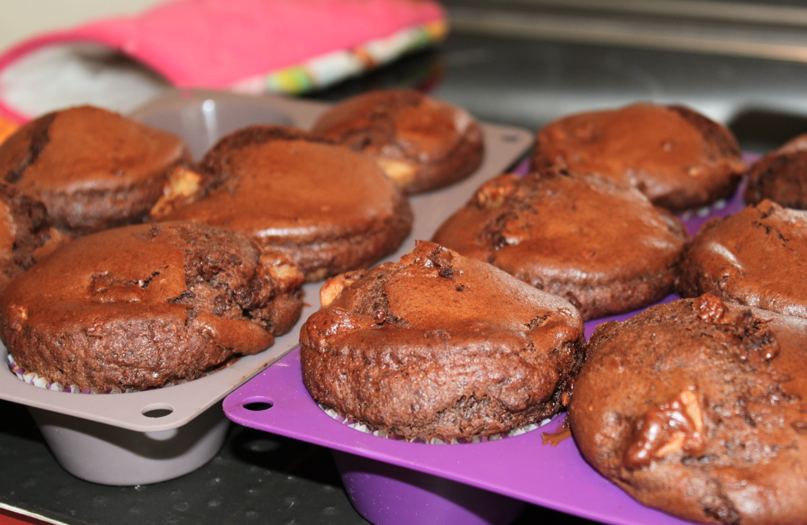 Sur la photo j’ai peut être un chouia trop garni les moules parce que certains muffins étaient simplement énormes. Alors mieux vaut garnir seulement à ras du moule.