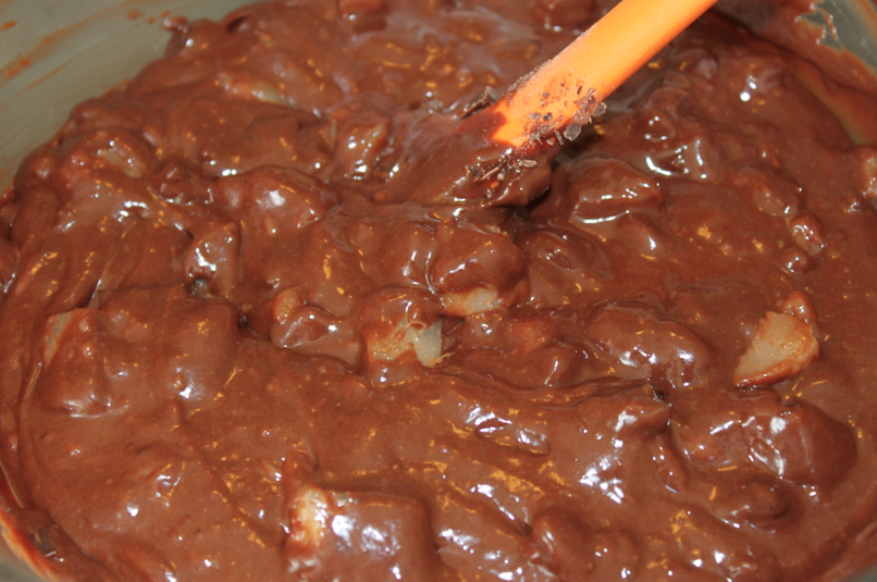 Ajouter les petits bouts de poires, et les pépites de chocolat. Mélanger.