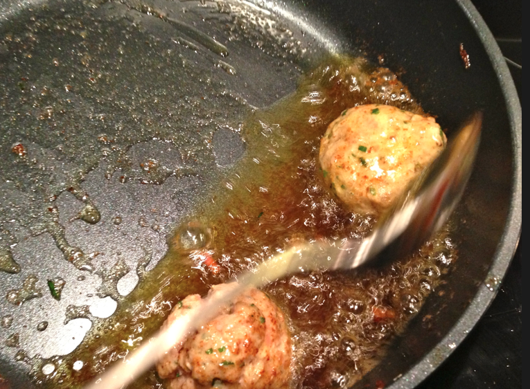 Je les ai fait cuire deux par deux pour être sûre qu’elles soient bien imbibées d’huile. J’incline la poêle et avec une cuillère je mouille les boulettes d’huile. Laisser bien dorer, il faut que la boulette se tienne.