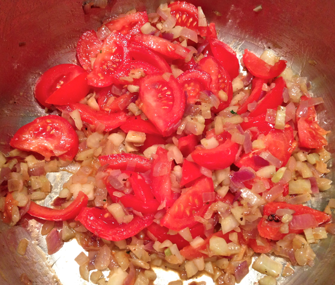 Une fois que les ingrédients sont pratiquement devenus translucides, ajouter les tomates grossièrement coupées.