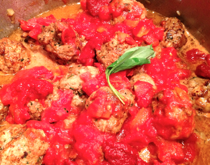Ajouter y les boulettes, la pulpe de tomate, le demi pot de concentré de tomates, quelques feuilles de basilic et l’équivalent d’un pot et demi de pulpe de tomate rempli d’eau. Saler et poivrer.