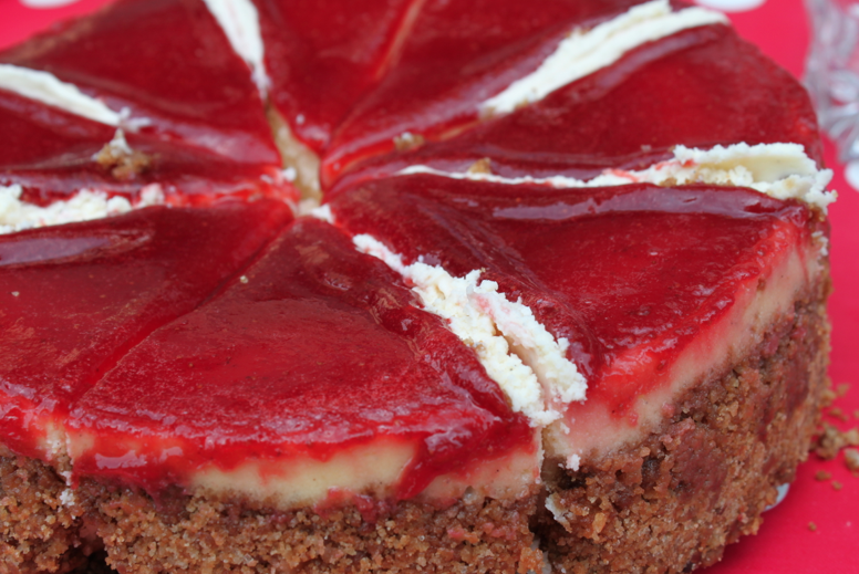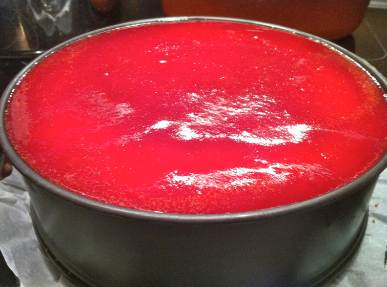 Faire fondre la confiture de fraise (au micro-onde ou dans une casserole) et la faire couler sur le haut du cheesecake. Moi j’ai choisi d’utiliser de la confiture de fraise maison (voir la recette sur le blog).
