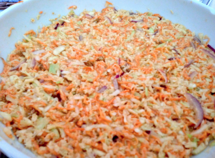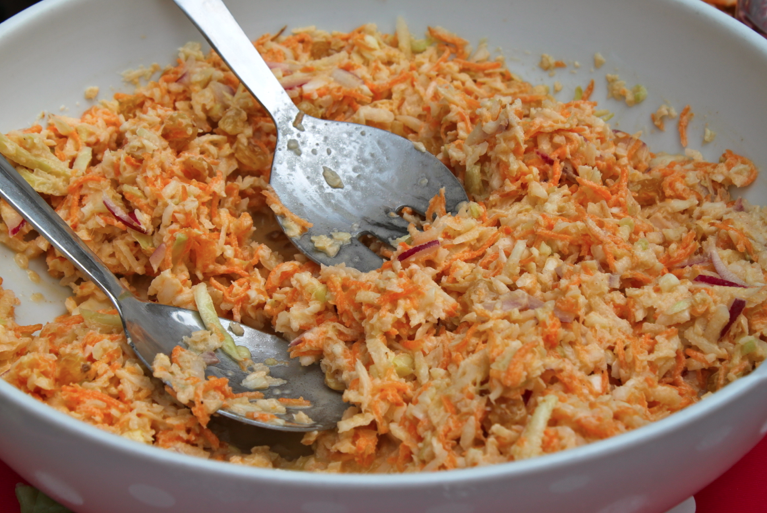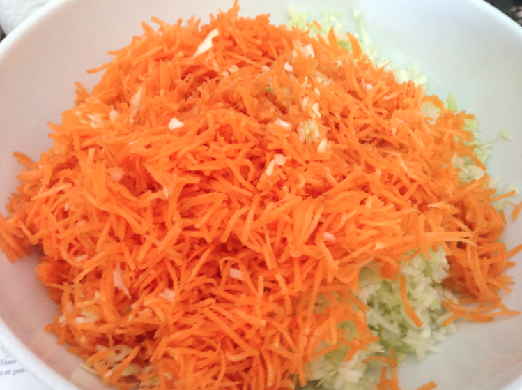 Rapper le choux et les carottes (pas trop finement si possible). Hacher finement la moitié d’un oignon rouge (facultatif). Incorporer dans un saladier.