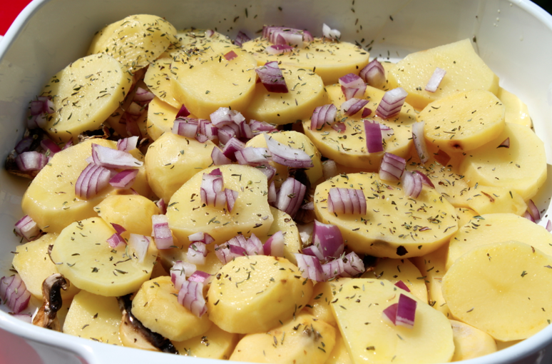 Imbiber d’huile un plat qui peut aller au four. Déposer les pommes de terre en couche et ajouter entre chaque couche un peu d’huile. Parsemer d’un demi oignon haché et d’herbes de Provence. Saler et poivrer.