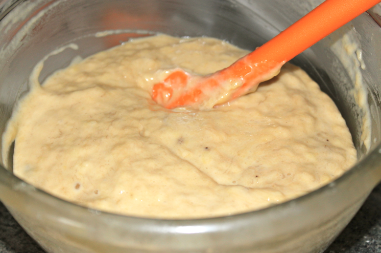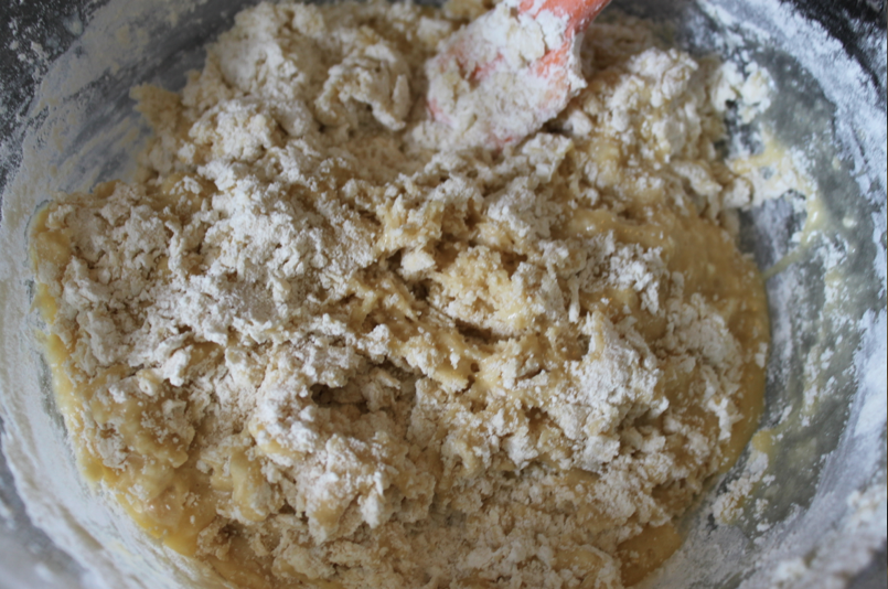 Mélanger grossièrement à la cuillère en bois ou à la maryse (surtout pas au fouet) jusqu’à obtenir une pâte homogène.