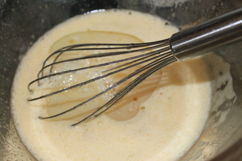 Pour les liquides, mélanger les œufs en omelette et le sucre. Y ajouter le lait, l’huile et la cassonade.