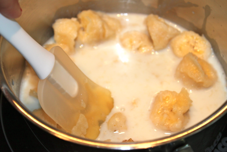 Ecraser la banane au fur et à mesure que le mélange chauffe (plus la banane est mûre plus elle s’incorporera facilement).