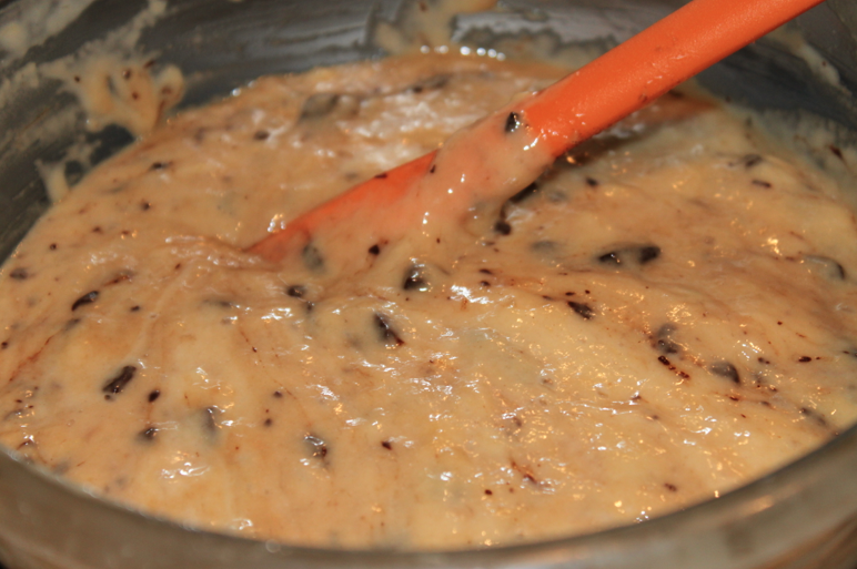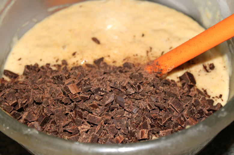 Intégrer les pépites de chocolat. Moi je les fais moi même avec un couteau bien tranchant.