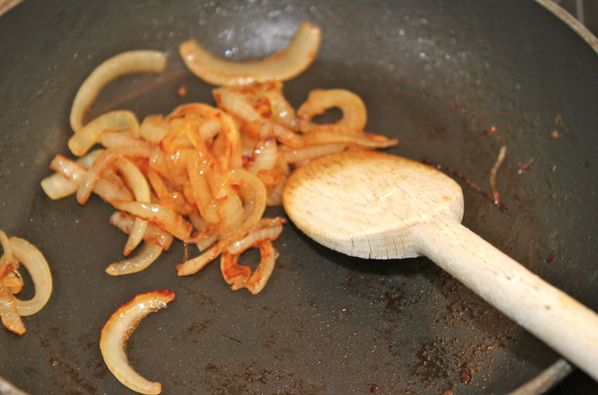 Faire chauffer à feu moyen l’équivalent d’une petite cuillère à soupe d’eau dans une poêle. Lorsque l’eau boue ajouter les oignons.