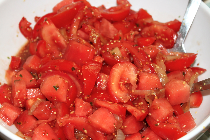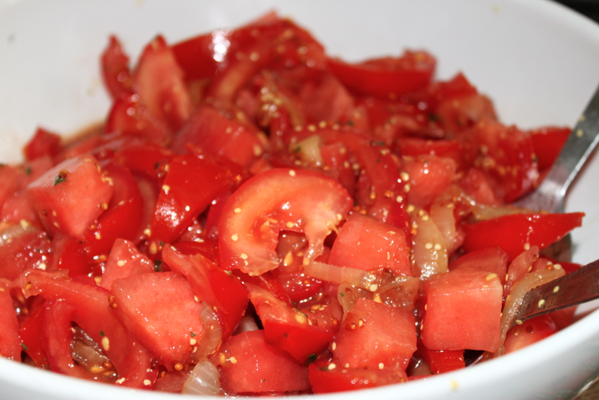 Couper les tomates en lamelles et les incorporer petit à petit aux morceaux de pastèque.
