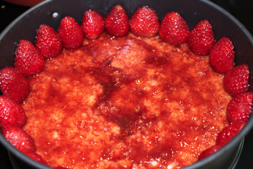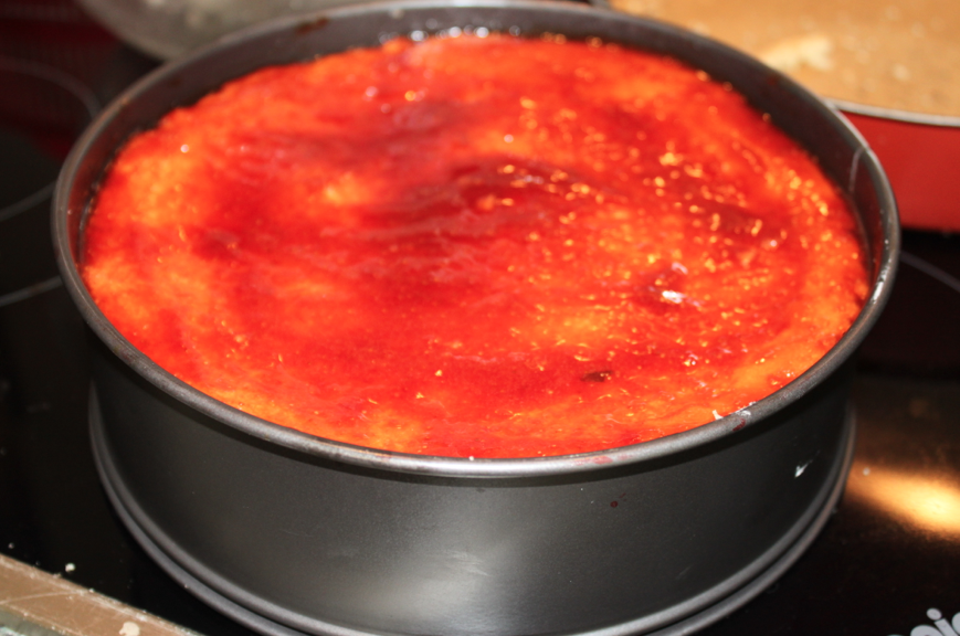 Placer au fond du moule la moitié de la génoise (face extérieure en bas). Badigeonner d’une ou deux cuillères à soupe de confiture de fraise pour que la génoise soit bien imbibée.On peut tout à fait badigeonner avec un mélange de sirop de canne à sucre et de grenadine, c’est plus classique. Personnellement je trouve que la confiture se marie bien avec cette recette plus légère.