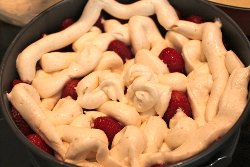 Garnir grossièrement en passant entre les fraises et en passant bien sur les bords. Vider entièrement la poche.