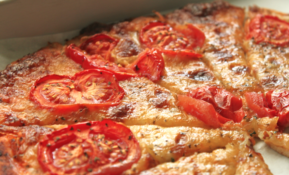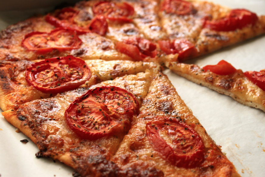 Répartir de manière homogène (moi j’utilise le dos de la cuillère pour ça). Ici pas besoin de mettre plus de sauce tomate, les tomates fraiches et la mozzarella vont d’elles à la cuisson créer une base pour la pizza.