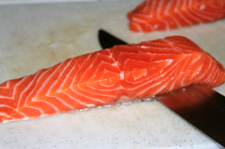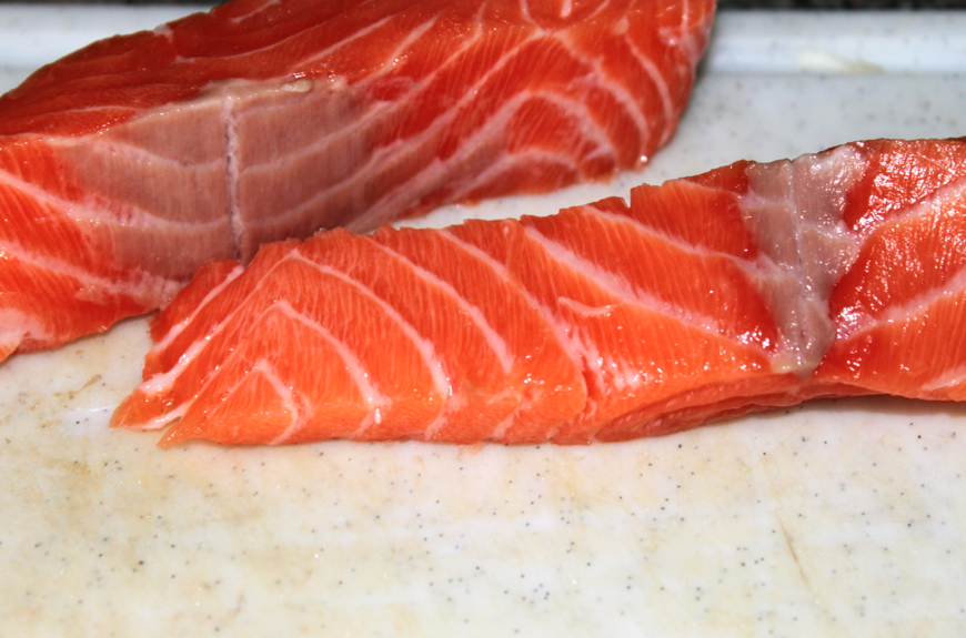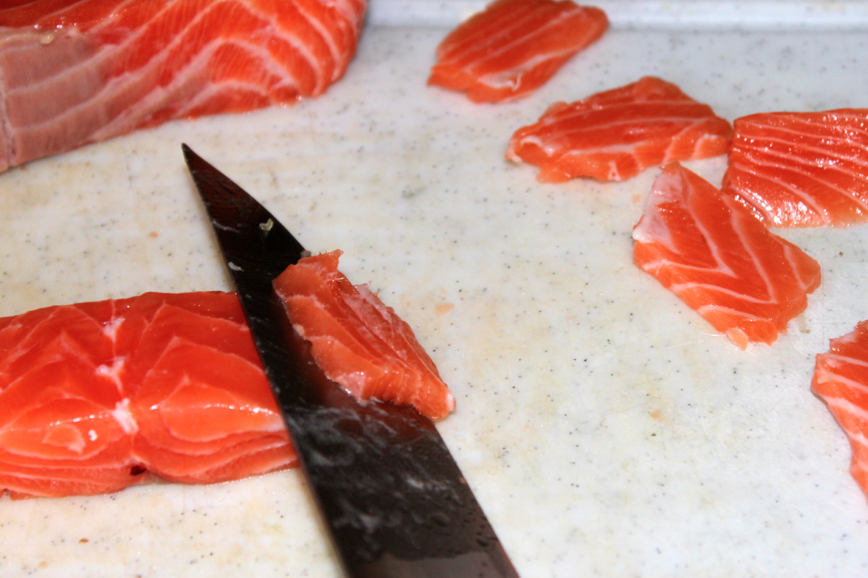 Toujours à l’aide d’un grand couteau (de préférence) couper des tranches de saumon. Ne coupez pas des tranches trop fines comme pour du saumon fumé par exemple, mais plus épaisse comme pour des sashimis. Moi sur les photos j’ai fait entre les deux.