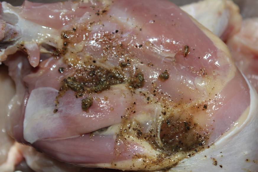 A l’aide d’un couteau, faire un trou ou deux dans chaque pièce de poulet et garnir de pâte. A priori vous devriez finir la quantité de pâte (non mise de côté), si il vous en reste n’hésitez pas à faire d’autres trous ou à garnir un peu plus les trous existants.