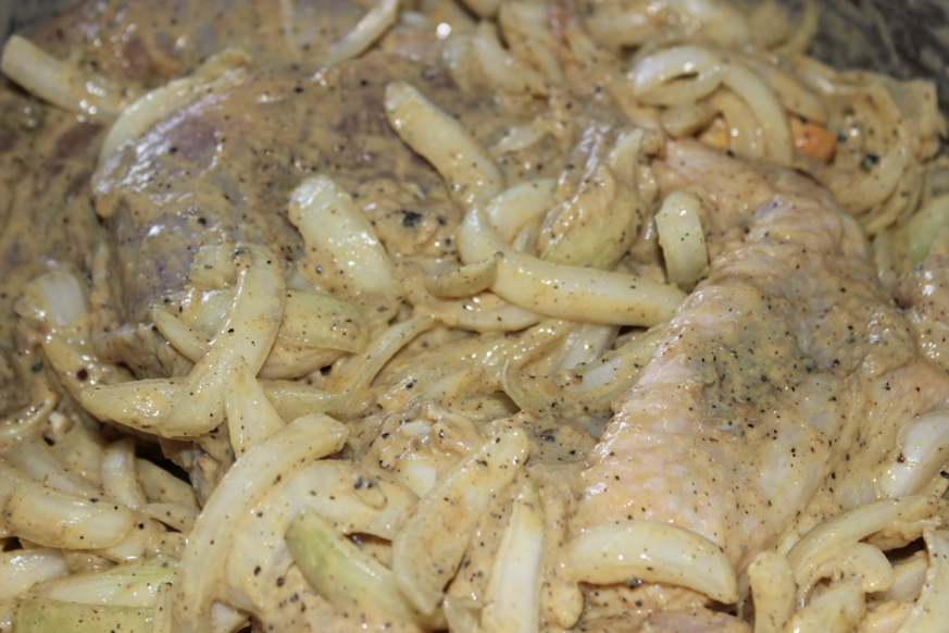 Réserver tous les morceaux dans un grand saladier (moi j’ai viré la carcasse). Prenez un saladier assez grand pour vous permettre plus tard de bien mélanger les éléments de la marinade.