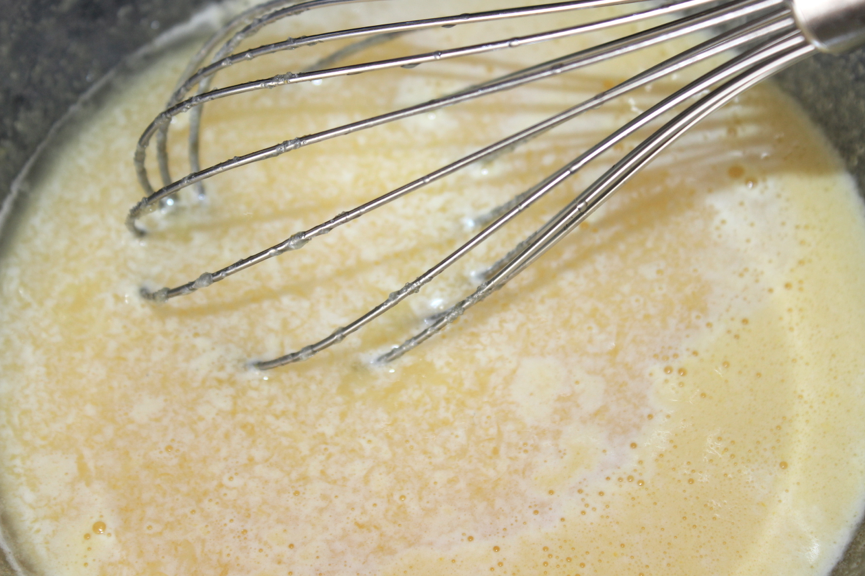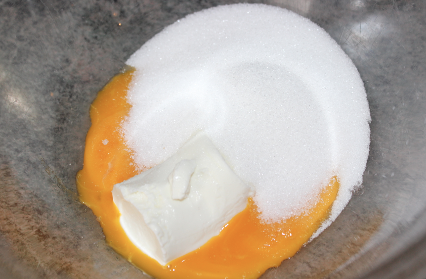 Mélanger ensemble le petit Gervais, le sucre et les jaunes d’œuf. Rendre la texture homogène.