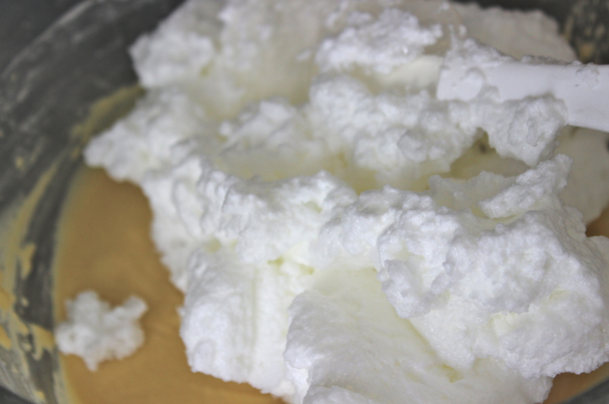 Ajouter les blancs montés en neige à la pâte à gâteau, en deux fois en mélangeant à la maryse ou à la cuillère en bois jusqu’à obtenir une consistance homogène. Le but étant de ne plus voir de morceaux blancs.