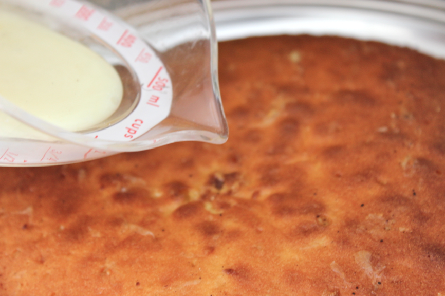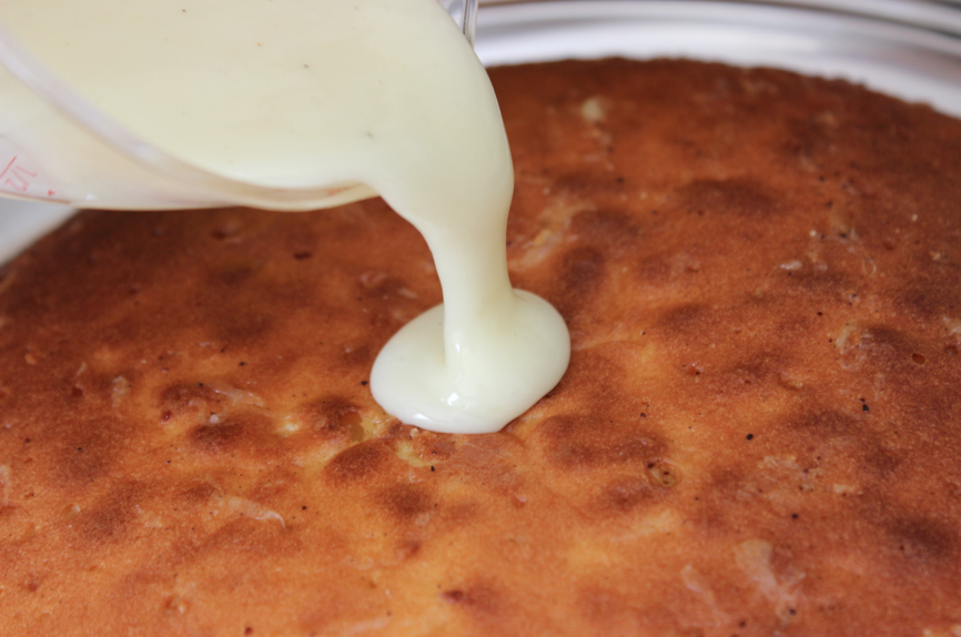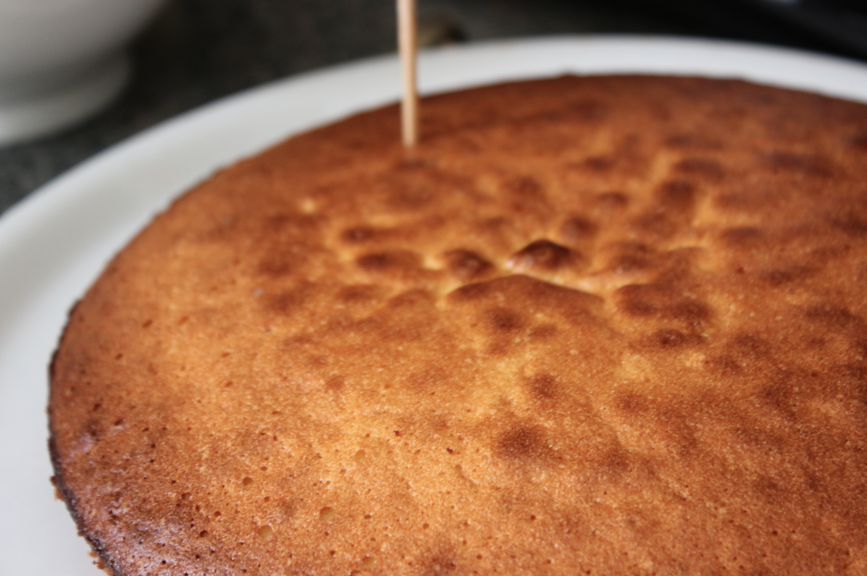 A l’aide d’un pic en bois (ou à défaut d’une pointe de couteau) piquer le gâteau. Le mieux est de former des trous mais sans atteindre le fond du gâteau. Renouveler sur l’ensemble de la surface.